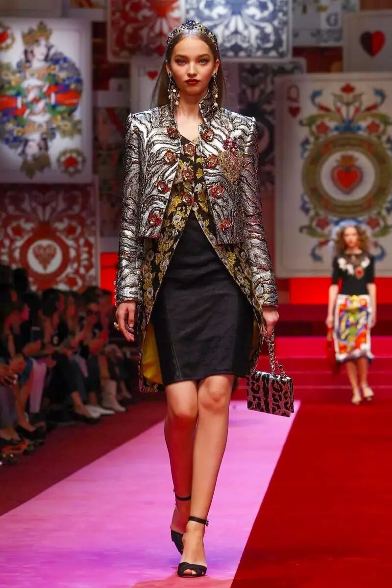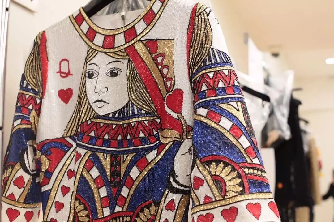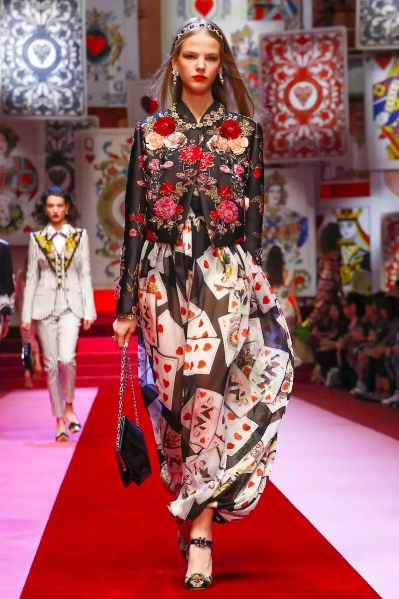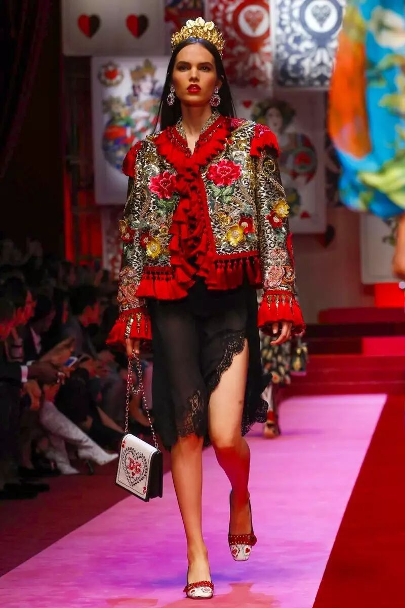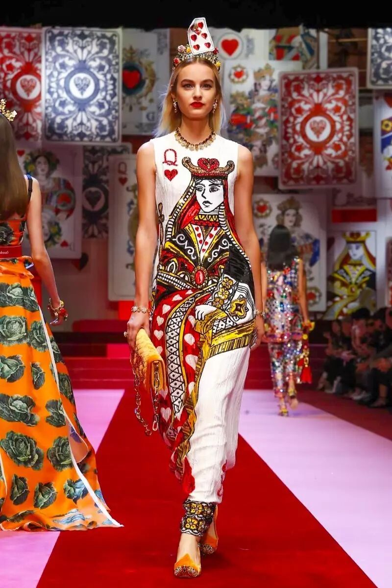 另外,本季Dolce&Gabbana还将趣味的扑克牌元素融入到了很多单品之中,比如浪漫华美的裙装与鞋包等配饰,把“Queen of ❤”的主题用到极致。