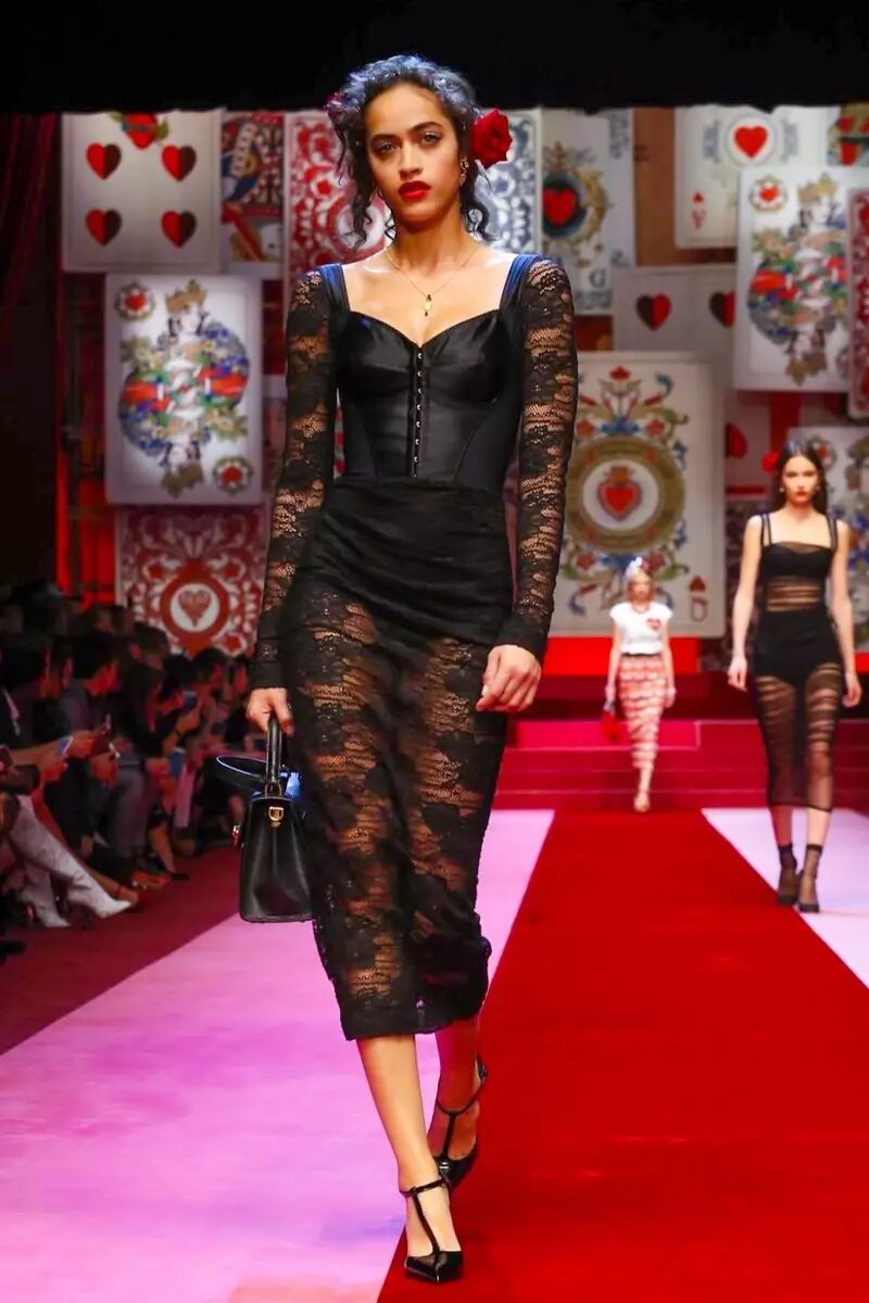 另外,本季Dolce&Gabbana还将趣味的扑克牌元素融入到了很多单品之中,比如浪漫华美的裙装与鞋包等配饰,把“Queen of ❤”的主题用到极致。