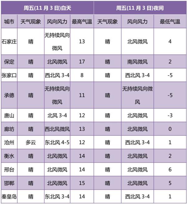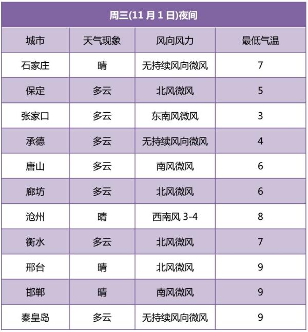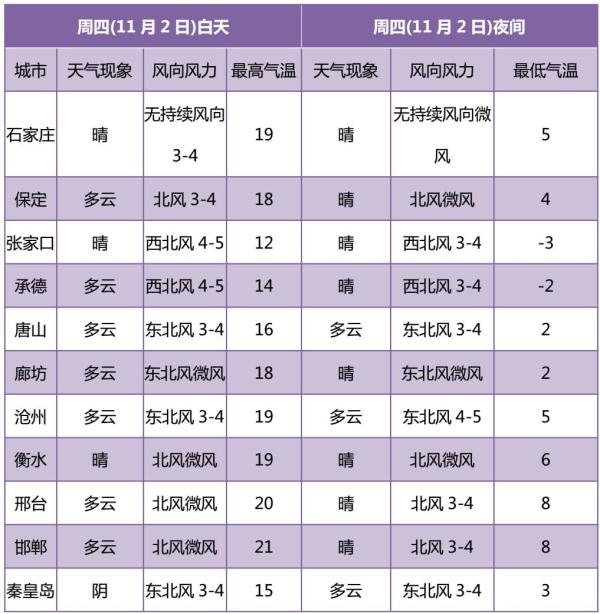 预计明天(11月2日),河北大部地区最高气温变幅不大,北部地区设区市(张家口、承德、唐山、秦皇岛)最高气温为12℃至16℃,中南部地区各设区市为18℃至21℃;