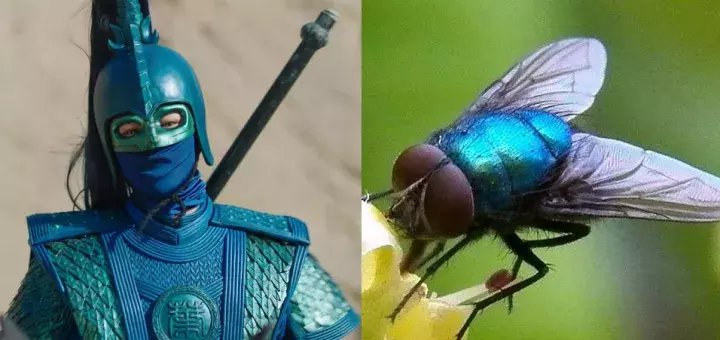 女主角蓝绿盔甲,参考了……苍蝇(?)的天然配色,蒙面造型,可能也汲取了前辈的雷人创意。