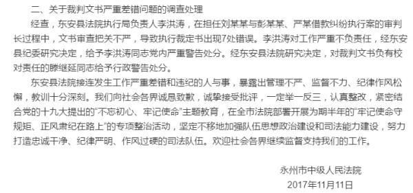 通报称,“2017年11月5日,网曝‘东安法官魏凯扬醉酒休庭’; 7日,网曝‘东安法院裁判文书多处错别字’。永州市中级人民法院党组指派监察室联合东安县纪委、东安县法院监察室进行了调查。”“经查,东安县法院执行局负责人李洪涛,在担任刘某某与彭某某、严某借款纠纷执行案的审判长过程中,文书审查把关不严,导致执行裁定书出现7处错误。李洪涛对工作严重不负责任,经东安县纪委研究决定,给予李洪涛同志党内严重警告处分。经东安县法院研究决定,对裁判文书负有校对责任的滕继延同志给予行政警告处分。”