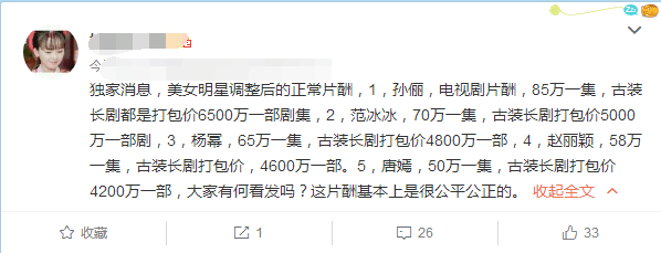 娱乐圈艺人们的片酬多少一直以来都是粉丝们津津乐道的话题,而在今日,有网友在某社交平台爆出五位当红女星具体片酬。不看不知道,一看吓一跳,原来女星们片酬都这么高的呀,接下来,就让我们一起来看一下吧。