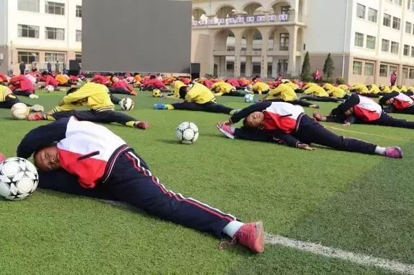 在推广足球韵律操的同时,柔韧操也被结合在了一起。横叉、竖叉、肩肘倒立这样的高难度动作,孩子们做起来也是轻松自如。