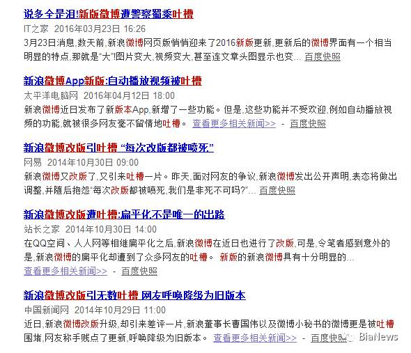 几乎新浪微博每次重大改版都会引来吐槽,但这也无法阻止微博用户的增长。后台用户数据与用户体验口碑,相信任何一家公司都会相信并依赖数据反馈,即使口碑差,用户量也上去了,为什么要听用户的?
