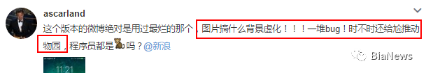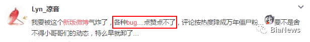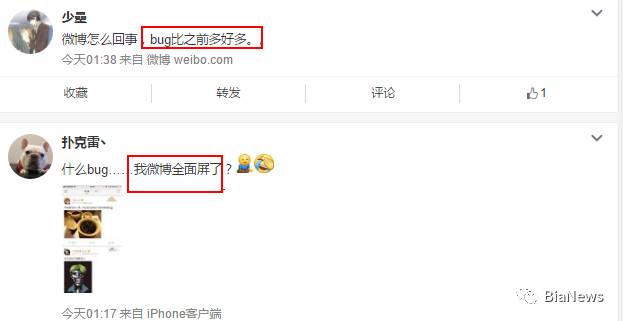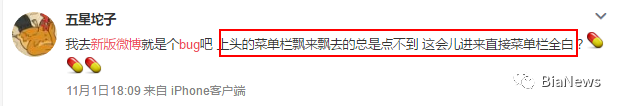 除了大V,微博上还有很多普通网友吐槽新版微博的诸多bug,比如菜单栏飘忽不定、评论或消息内容无法显示、胡乱推送、卡屏等各种问题。