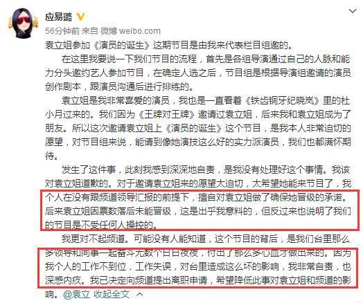 今天下午,袁立的朋友迫于压力被迫辞职,她在微博中主动包揽了责任,称是自己在未向领导汇报的情况下擅自对袁立做出了确保晋级的承诺,最后她还澄清节目是不受任何人操控的,因为自己的失误对节目造成了非常不好的影响,所以自己决定提出离职申请,希望能降低此事对节目和袁立的影响。