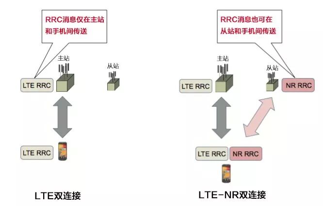 RRC独立连接:在4G时代的LTE双连接中,仅主站负责与手机之间的RRC连接,而在LTE-NR双连接中,从站(即5G基站)也可负责与手机之间的RRC连接(如下图)。