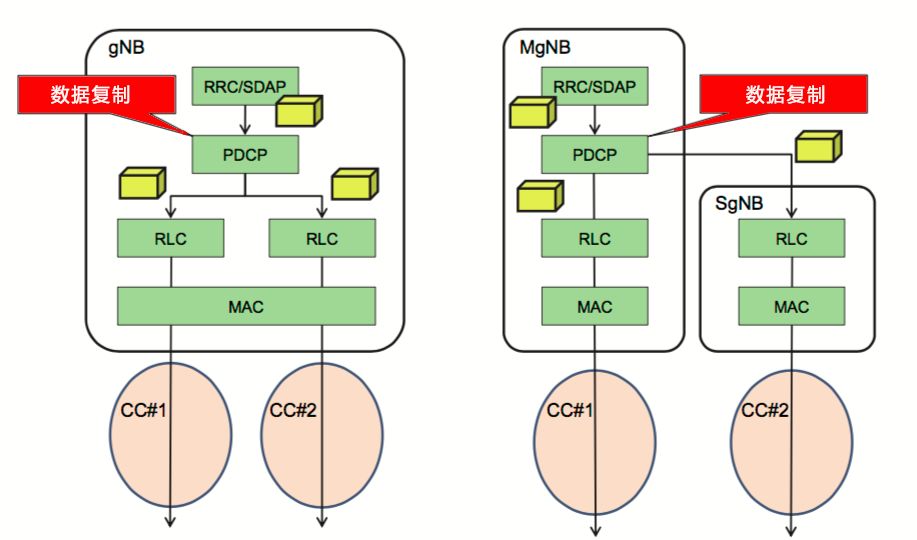 如上图所示,数据包在PDCP层处理和复制,并通过每个RLC层,再通过相关的CC发送,接收端处理较早到达的数据包,同时抛弃较晚到达的复制的数据包。