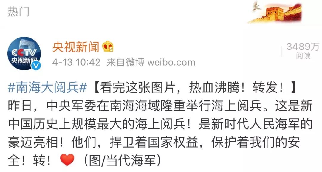 关于#南海大阅兵#这个热搜,评论基本上全部都是点赞、为祖国打call的积极评价。其中,央视新闻官博这条点赞有13万!一般来说,央视新闻官博的日常微博,点赞一般不过一万哦。