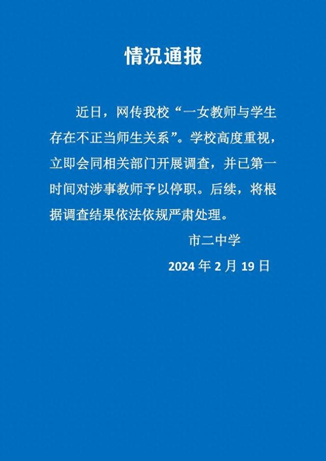 2月19日,上海市第二中学发布情况通报,称学校高度重视,立即会同相关部门开展调查,并已第一时间对涉事教师予以停职。后续,将根据调查结果依法依规严肃处理。